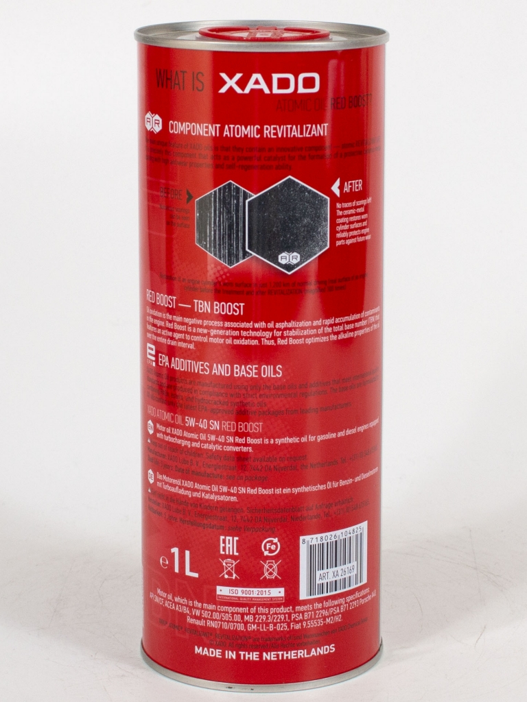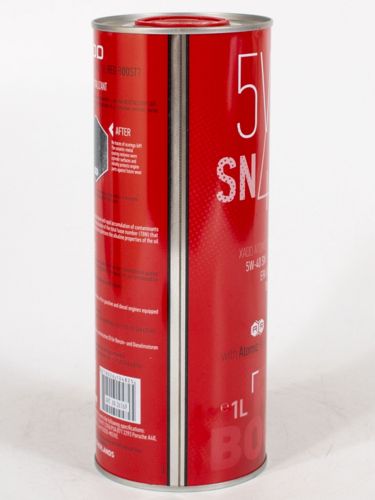 XADO Atomic Oil 5W-40 SN RED BOOST — современное универсальное моторное масло для бензиновых и дизельных двигателей легковых автомобилей и лёгкого коммерческого транспорта.  Может использоваться в двигателях, оснащенных каталитическими нейтрализаторами, турбонаддувом и системами непосредственного впрыска топлива.